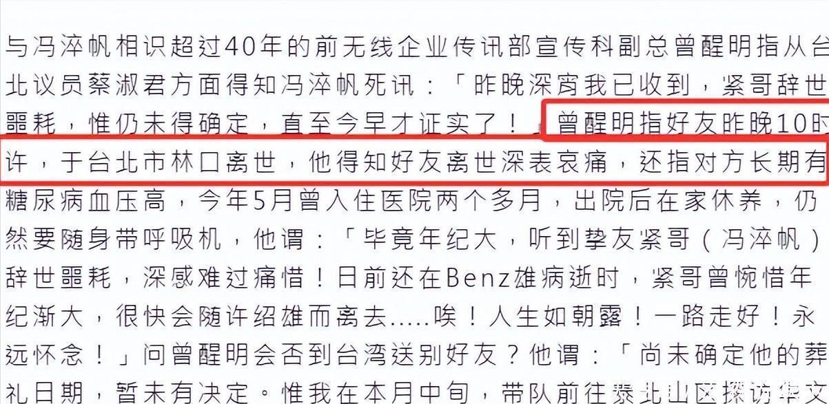 10日晚,港星冯淬帆在台北病逝,享岁。一语成谶,世事真比剧本狠。